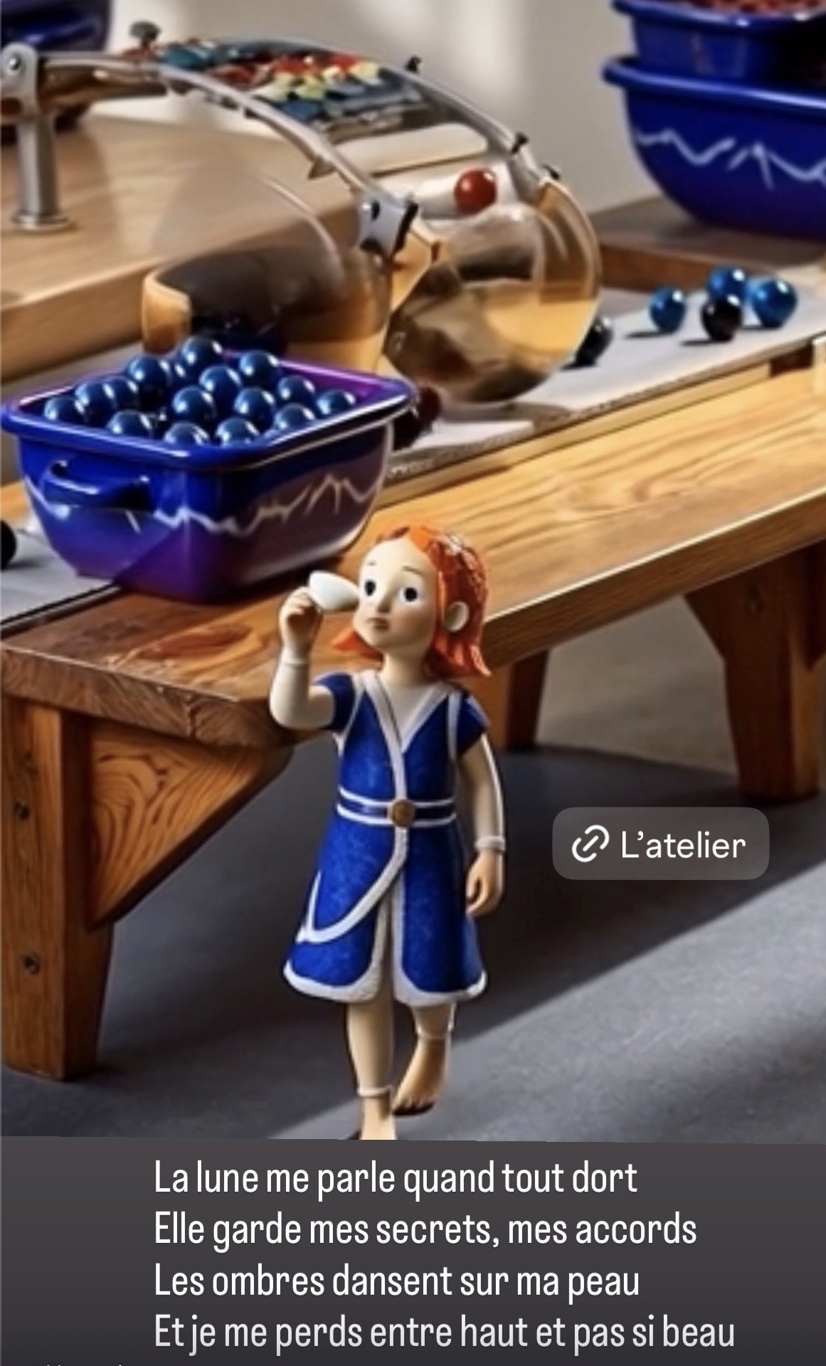 A doll with red hair, wearing a blue and green dress, standing on a curved staircase inside a building with ornate wooden banisters. The doll holds a small decorative bucket in one hand.