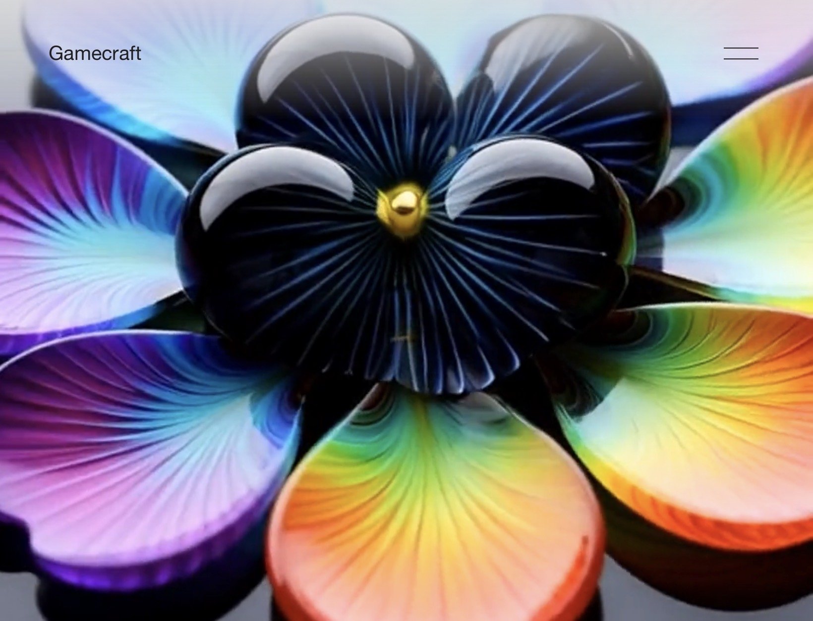 Colorful glass sculpture resembling a flower with multicolored petals and a dark spherical center, set on a reflective black and brown base.